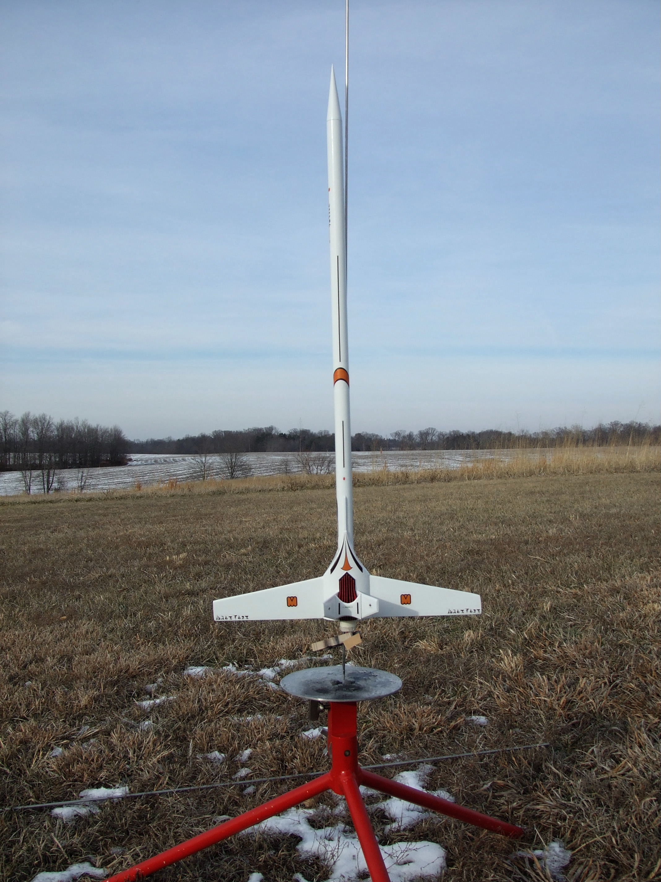 The kit comes with a crepe paper streamer rather than a chute. Mine weighs in at 1.46 ounces without motor, so it's borderline whether to go chute or streamer. On this flight, the shock cord got caught around the fins (thus my conclusion deployment was just past), so the streamer's effectiveness was impaired a bit. The result was a nearly ballistic descent, way too fast. It didn't help that this was a midwest winter day, frozen ground. I ended up mashing in the front 1/2" or so of body tube, not exactly fatal damage but more than I'd like on something I put so much effort into giving a top notch finish. After repairs, I'm ditching the streamer for a decent chute.