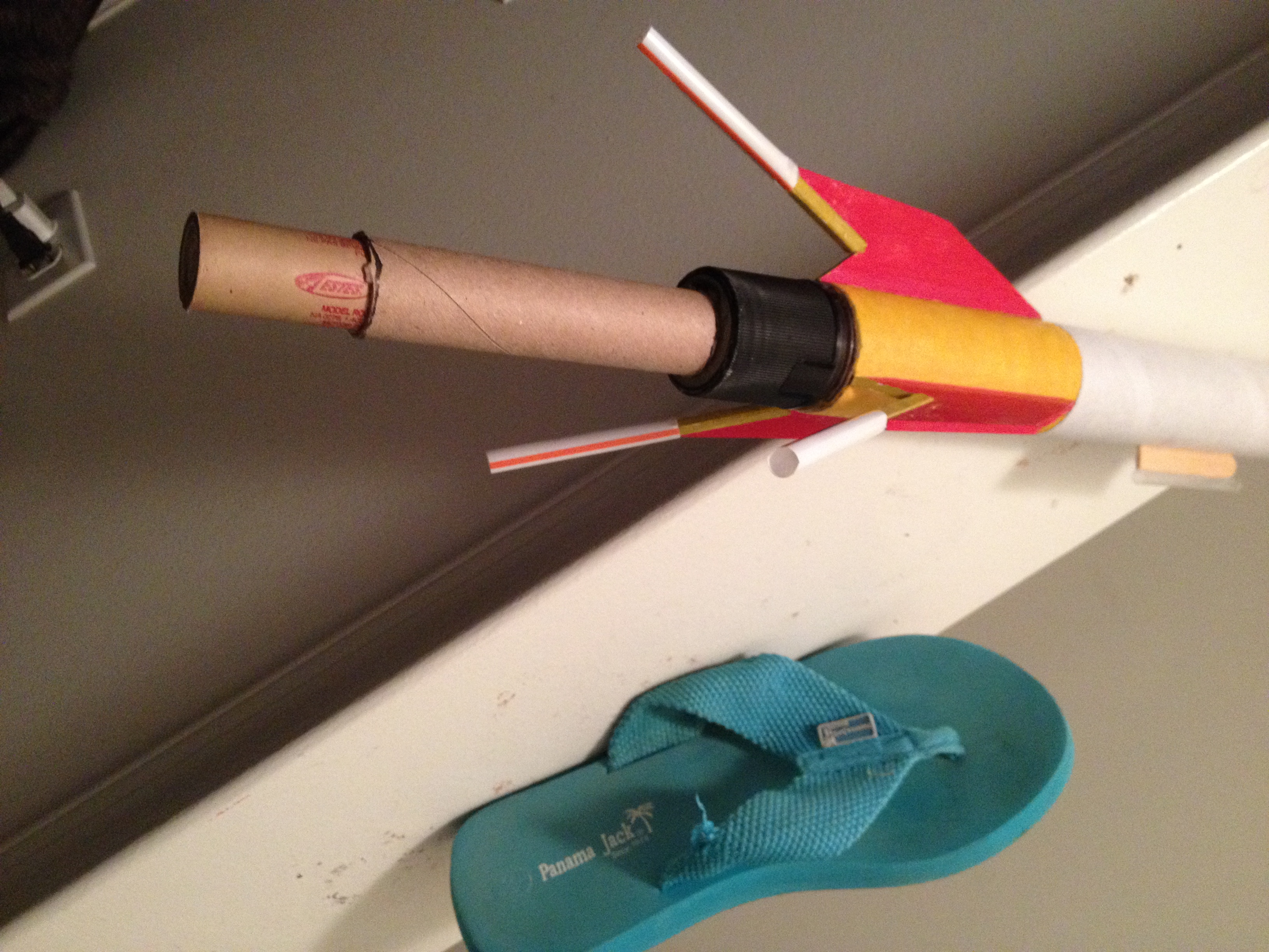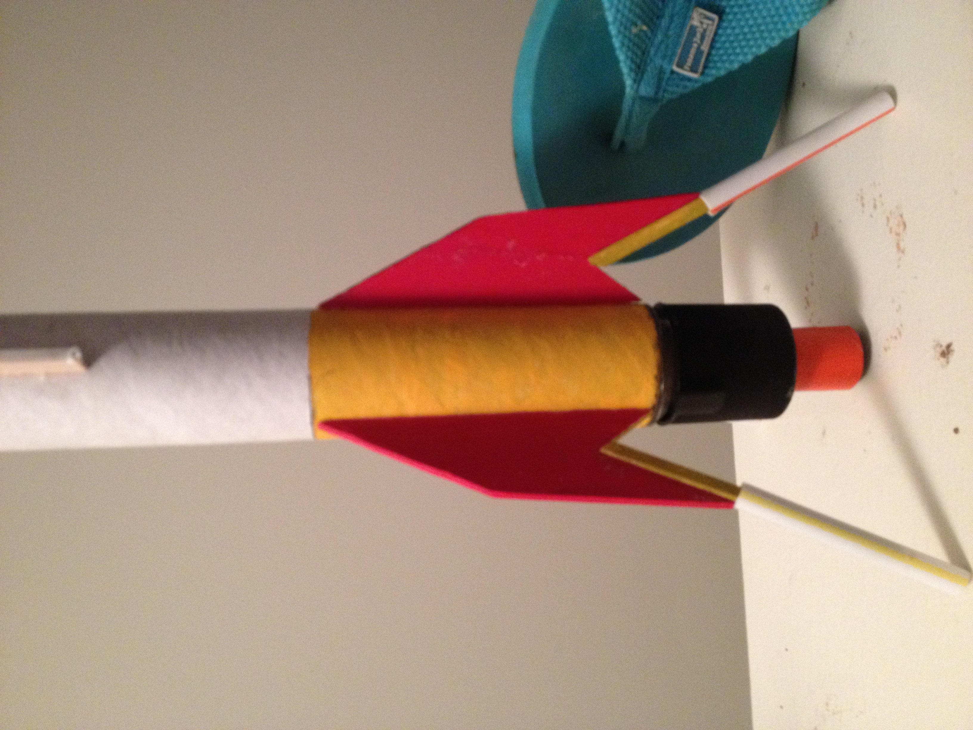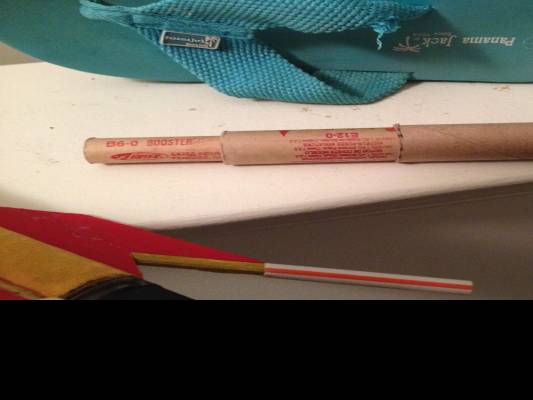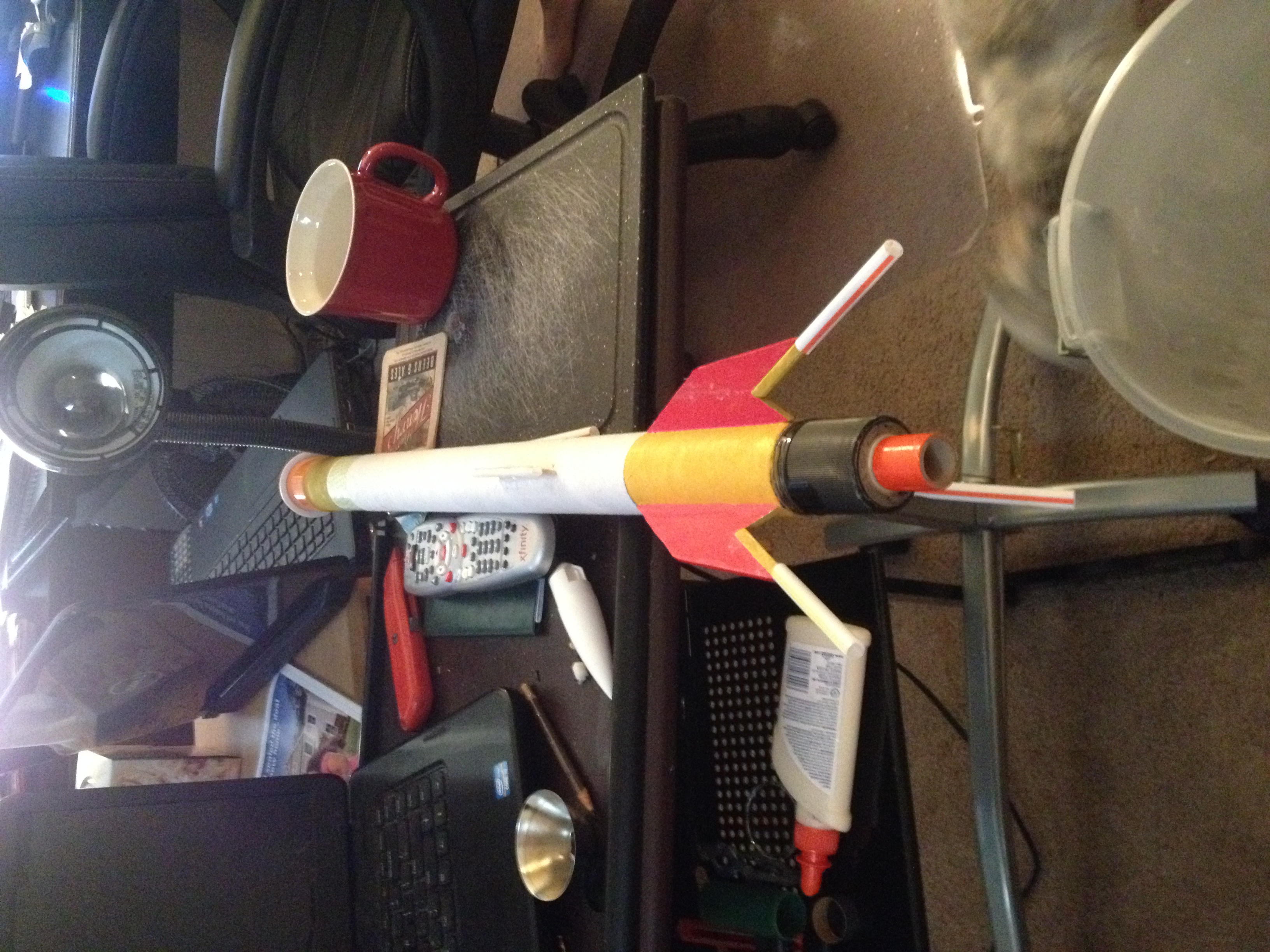 made from a thick sided tube. nose cone is a half ball door stop. motor mount made from a mouth wash cap & bottle. fins with stilts. motor mount mod on out side to fit boosters. with luck I mit see this Rocket again.