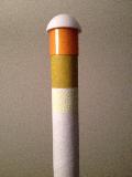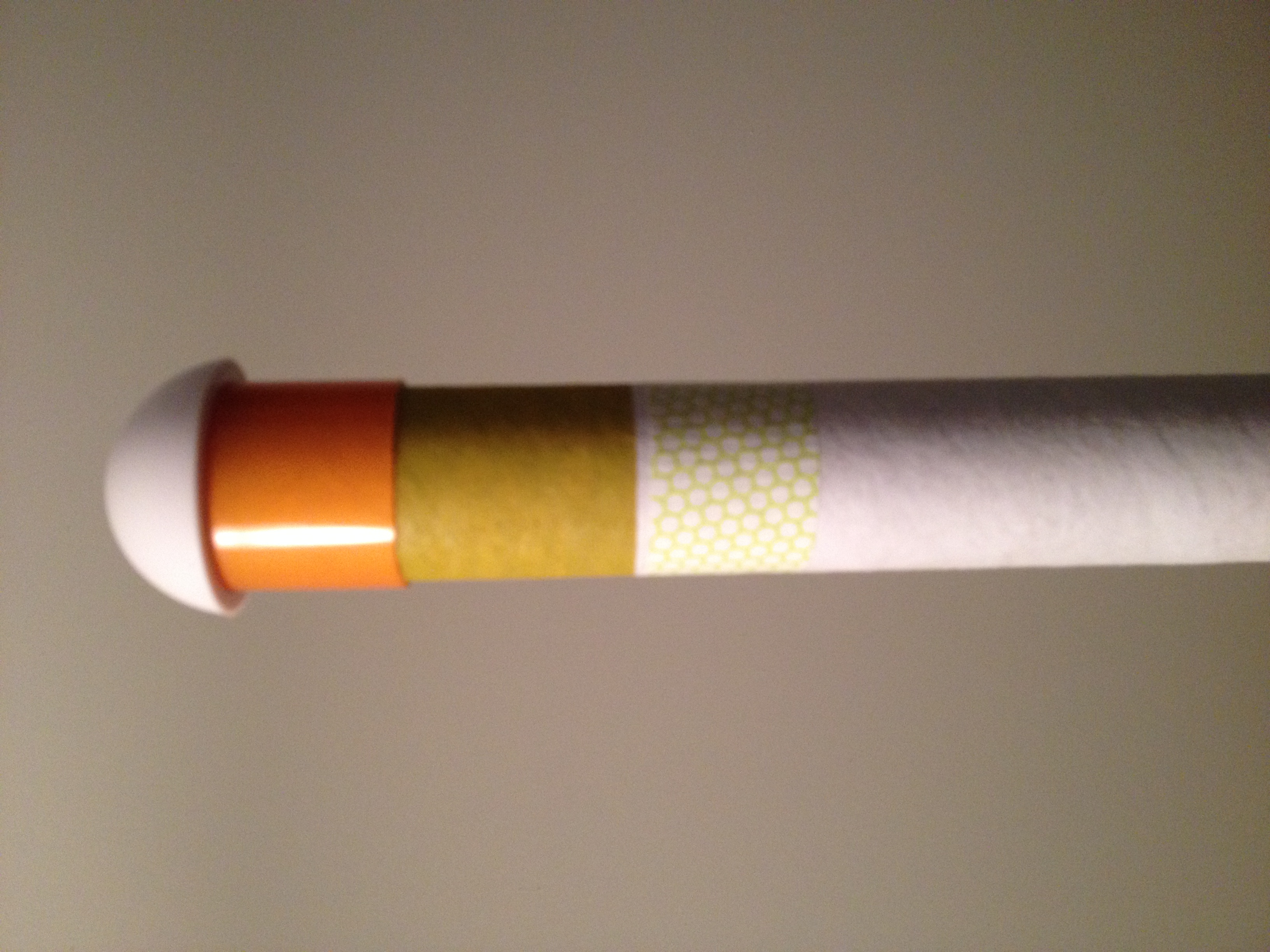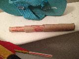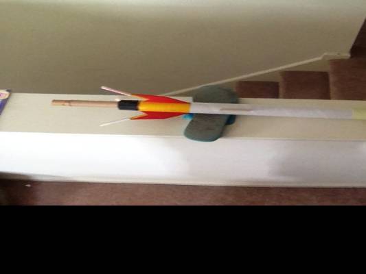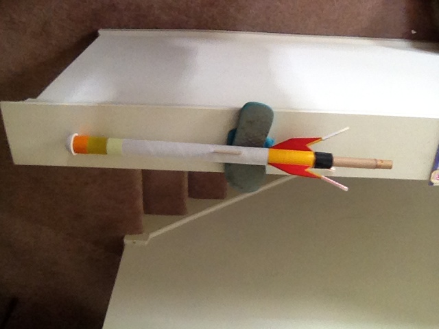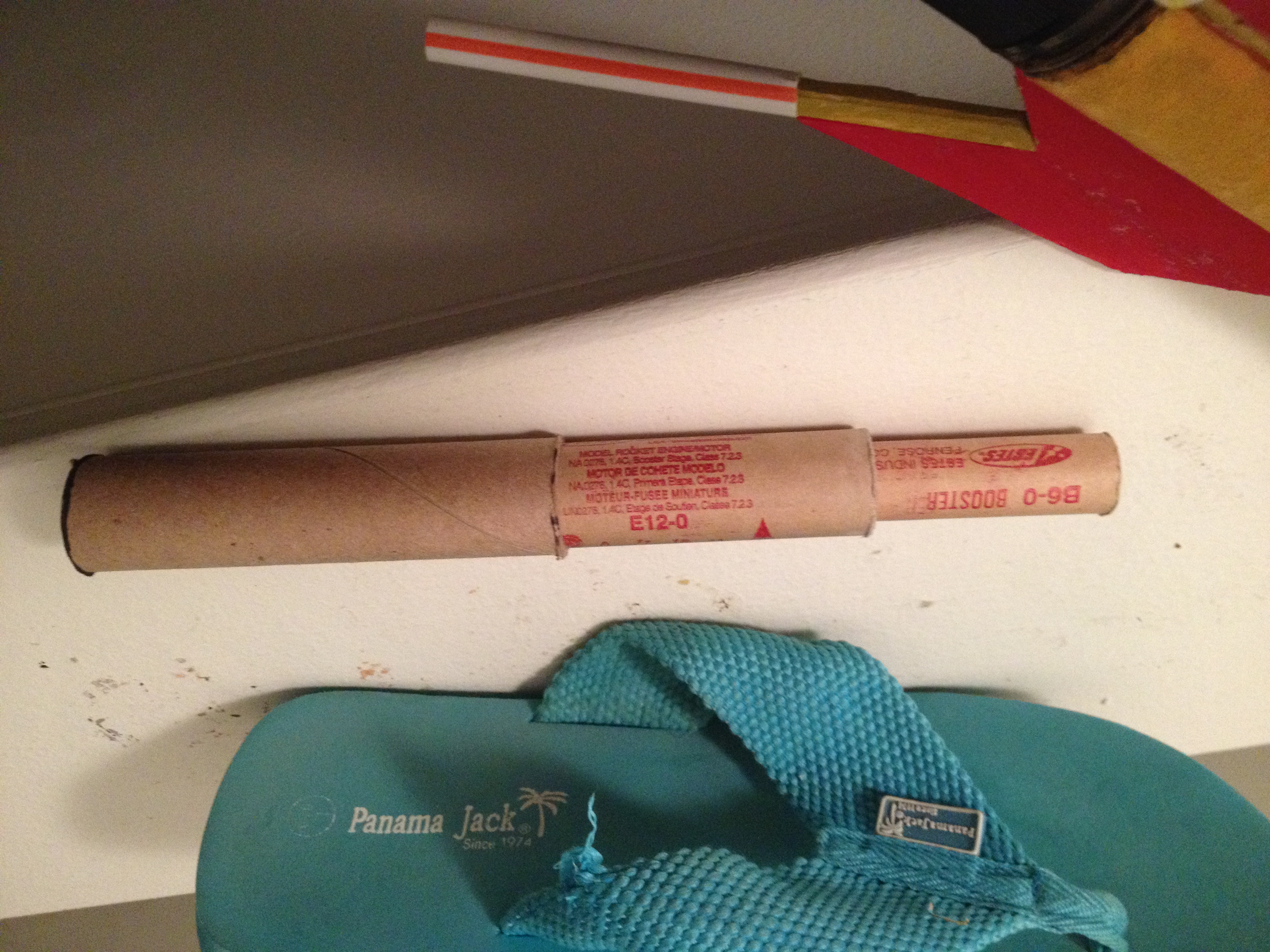 made from a thick sided tube. nose cone is a half ball door stop. motor mount made from a mouth wash cap & bottle. fins with stilts. motor mount mod on out side to fit boosters. with luck I mit see this Rocket again.