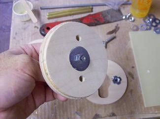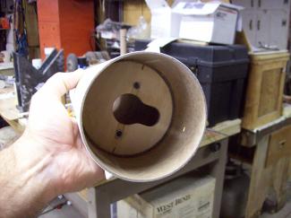 This bulk plate is epoxied into the cut-off piece of coupler tube previously mentioned and will mount permanently inside the payload tube, to receive and hold the electronics bay. Before doing that, a "keyhole" recess is cut to one side of the 29mm center hole, as shown in the accompanying photos, to clear the main ejection charge holder tube, which mounts in the forward end cap.