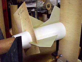 I used a pair of "V" blocks I had built to lay this in, which would let me rotate the tail cone as I installed the fins. Combined with additional jigs cut from luaun door skin plywood to properly position the fins at the right angles, my tail cone looked like a contortionist's day dream when the fins and jigs were in place. The bottom line is if you take you time and use your head, you can come up with the means to get your fins in the right places.