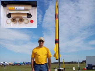 The author poses with the Crossbow, both sporting loud yellow wrappings. The Crossbow is loaded with a J260 Skidmark demo motor, made for the CTI Pro54 2 grain casing.