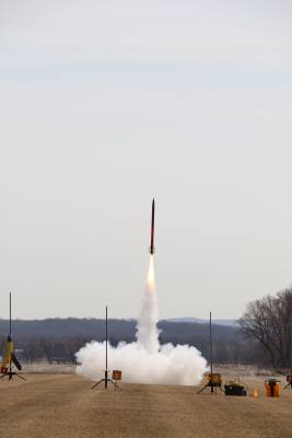 Split-fin fiberglass rocket with an aluminum nose cone tip. Soon to be painted black and gold and to have the name in vinyl on the side.