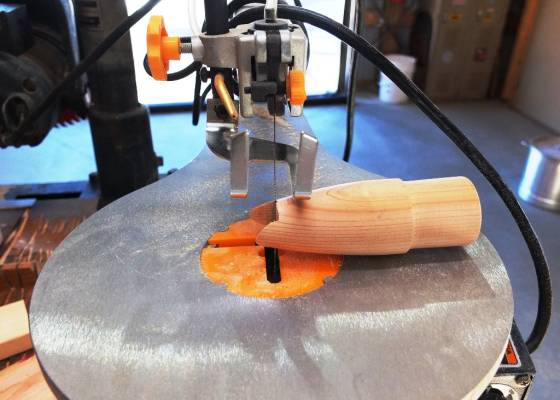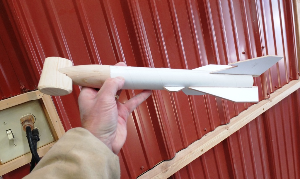 The nose cone I turned on my wood lathe from a pine 4 x 4. The hammer portion is made from a pine 1 x 3. The hammer is a tenon fit into the nose cone affixed using Gorilla Wood Glue. There's quite a nit of surface area for the glue, so it's quite strong.