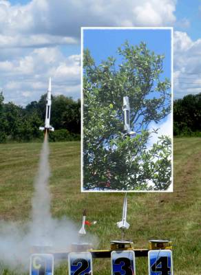 Good boost, no turns. The spill hole in the parachute wasn't big enough to compensate for the wind. It landed in a tree, 50 feet up! LOST.