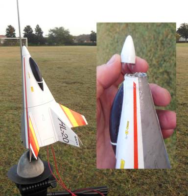 When picked up I realized why, the small nose cone was blown off the front of the shroud! It was found close by. The engine and streamer weren't found, I was too busy watching the "glider".
