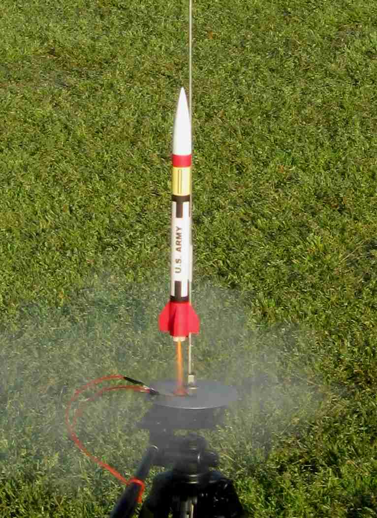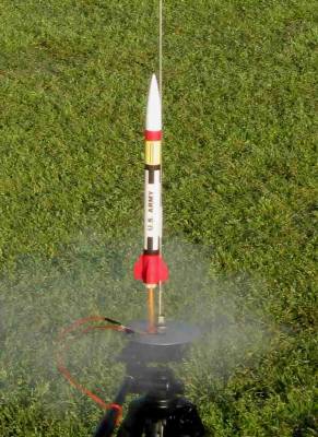A rolled carded rocket from printed and made from online PDF plans. This is the Red, Yellow White Black paint scheme based on the Estes version.