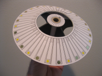 Second try with new saucer graphics. This time a foam board top, with printed cardstock on top of that. Labored flight, 100 feet altitude.