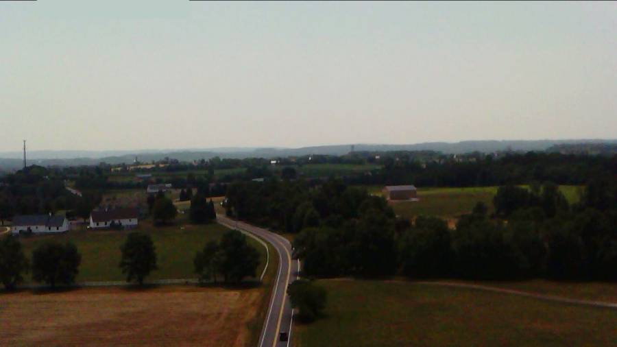 A photo looking south from the launch site at Fort Indiantown Gap, PA. This was taken from the Bandit HD, which at this point was about 150 feet above ground level. Since this rocket flew about two or three hundred feet higher than expected, it landed not in the flying field to the right but across the street in the field to the left, close to the road and periously close to a tall tree.