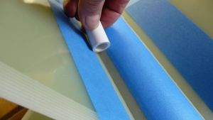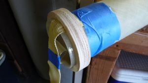 I applied the mixture to the fillet area with tongue depressors. This gave me a nice applicator and also started the shaping process. Once I got a nominal amount of epoxy in the fin root area, I used the PVC pipe piece to form the final fillet by running it around the fin root several times and tending to the excess. I saw another modeler uses a plastic spoon in a similar fashion. Pre-taping the fins and airframe as shown On Vern site made cleanup a breeze.