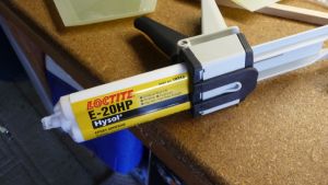I mounted the forward CR and strap to the MMT with Loctite Hysol E-20HP epoxy. This epoxy is an industrial grade epoxy with a shear strength of over 4500 PSI and is applied with a gun system that dispenses the 2:1 ratio ingredients perfectly through a mixing nozzle, eliminating the tedious task of measuring and mixing. I used this epoxy throughout the construction except for tacking the fins in place and creating the exterior fin fillets (see the fin section below).