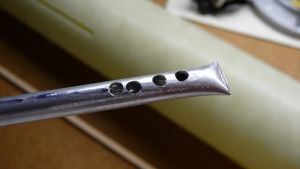 With the forward CR now firmly fixed, I made a special applicator extension for applying the epoxy for the middle CR out of a 12" piece of 0.25" aluminum tube. I crimped one end of the tube and drilled a series of small holes in one side and then taped the other end to one of a plastic mixing nozzles. By sliding the aluminum tube between the MMT and the booster before dispensing any of the epoxy, I was able to apply epoxy just where it was needed on the inside of the airframe and outside of the MMT, just ahead of the fin slots, resulting in a minimum of epoxy and mess.