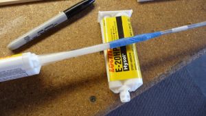 I made another tool for getting the epoxy up between the MMT and the airframe, this time using some Tygon tubing taped to the end of the epoxy mixing nozzle. Before pushing any epoxy out the end of the tubing/mixer nozzle, I ran the tubing up against the middle CR. I then laid a line of epoxy as I drew the tubing out. I sized the tubing such that drawing the tubing down between the MMT and the airframe created a nice fillet on both sides with a valley in the middle.