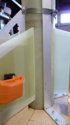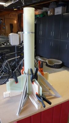The squares keep the booster perfectly plumb relative to the jig's base. So, along with some carefully constructed L-shaped angles made from pine and composition board, clamping the fins into position for proper alignment and attachment became a relatively simple task.