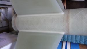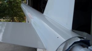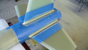 I then moved on to the exterior fin fillets. I once again went to the Master and basically copied Vern Knowles' method of filleting fins using a short section of PVC pipe to smooth and shape the fillets. I used Aeropoxy for this process, mixing in some West System 406 Filler to give it a more thixotropic (thick) consistency. I used a heaping teaspoon of filler per ounce of mixed epoxy. I found that I needed to let the mixture of epoxy and filler sit for a few minutes before using it to allow it to reach its nominal working consistency (the "mayonnaise" state, as suggested on the 406 box).