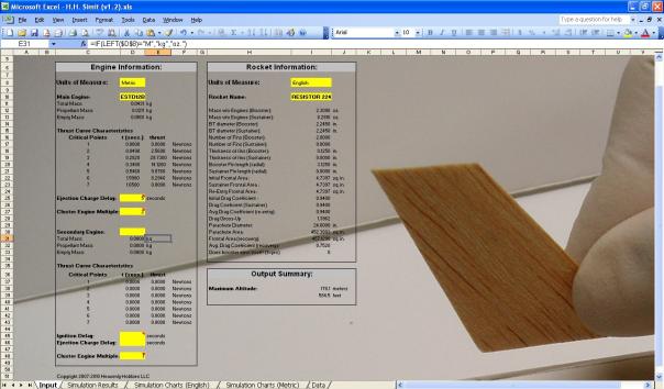 The Simit spreadsheet is a pretty basic simulator but should be a great help if you dont have access to a more robust program or dont want to take the time to enter the design. It can handle up to two stages with multiple motors in each stage. The program includes data for 10 motors, including the ones that would be most commonly used in the Heavenly Hobbies kits. The rocket parameters includes mass values and dimensions for the major components. It comes pre-coded for the Resistor 224, Backdraft and Brutus 2.6 kits. While the motor and kit data seems limited, the instructions describe how to add your own. After using the program and studying the results, you should be able to use it for just about any design. And ThrustCurve has the motor data you'd need. Even though you may select English or Metric values on the input screen, results are provided for both. It appears the factory entered motors use metric units but the designs use English. The units setting needs to match these.