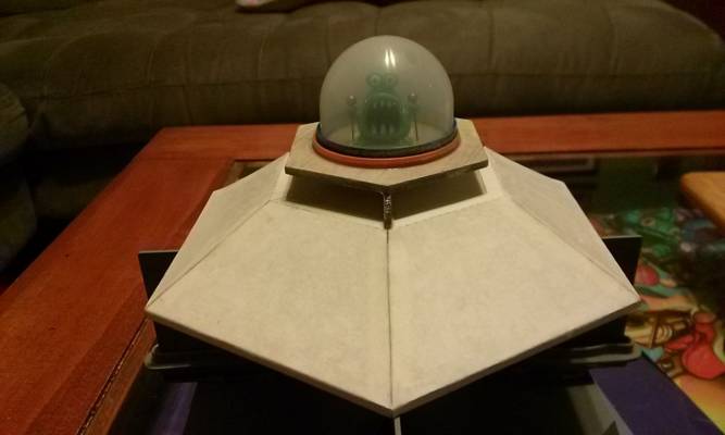 Rocketarium Hexagon with custom added upper deck "alien cockpit" and lights for the full UFO effect. Still in development, but going well and near finished. Upper deck is created to allow use of delay charges so that the charge is vented out to the sides. Allows a greater selection of motors as well as a bit of simulated "saucer attack" blasts (or help signal flares however you view it) as the saucer comes down. First modified launch resulted in a broken plastic cover, so I started looking for flexible/more durable alternatives. Search was long and painful (even tried custom rubber molding without success. Ended up using the same plastic vending machine bubble (but a new one) and adding on a Nerf Mega Dart tip along with a Lego "antenna". The Nerf tip should help absorb some impact and the antenna is to make it look better and also can be folded forward into "Disintegration Ray" mode. Lots of fun! Love the bottom paint job too...simple, but great results.