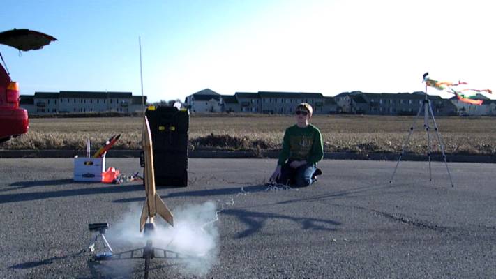Connected camera to the outside of the rocket with rubber bands. Rocket arced towards the southeast, but flew relatively straight. Parachute deployed and opened. Daniel recovered about 80 yards southeast of the launch site. No damage, but the camera did not record the flight. Believe the launch shock hit the button and turned it off.