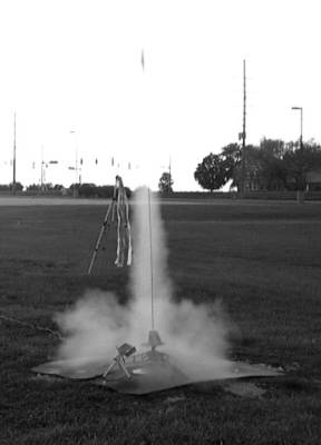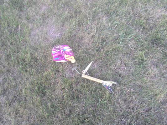 Good flight that arced towards the southeast.  Very high flight.  Visible throughout flight.  Golden fins caught the light of the sun.  Parachute deployed and opened.  Rocket landed about 80 yards southeast of launch site.  Daniel recovered.  No damage.