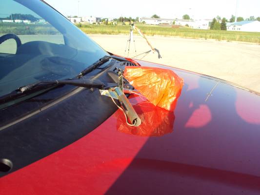 Calm, 85 degrees, clear skies. Took several seconds for rocket to launch. Rocket visible throughout flight. Parachute opened and deployed, but was caught on fin. Rocket landed on the roof of the truck and rolled down to the hood about 10 yards from the launch site. No damage.