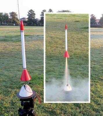 Nearing the 300' apogee there was a little wiggle as it slowed down, something to expect with a conical stability rocket. At ejection the metallic streamer attachment string broke. Both the model and streamer fell separately with no damage.