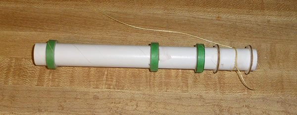 I first secured the fin unit to the main body with a couple of wraps of masking tape. The kit's motor mount protrudes about 1/2" below the lower body tube. Instead of wrapping the motor with tape and cramming it into the motor tube, the instructions say to install the motor and then tape it to the motor tube. This should make removing the spent engine easier, so I gave it a try. My motor of choice was a C6-5.