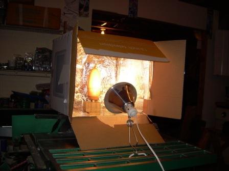 I used the same spray adhesive I made the foam block with to stick aluminum foil to the inside of a cardboard box. A ½ inch hole in a wood block holds the nosecone and a flood lamp provides the heat.