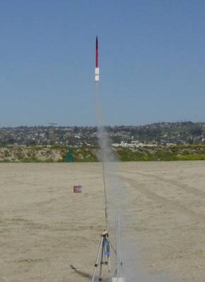 Payload - PerfectFlite Alt15K. Unstable boost led to tumble, then ignition of stable sustainer. Horizontal trajectory directly away from the flight line. Landed in sand prior to ejection. Minor damage.