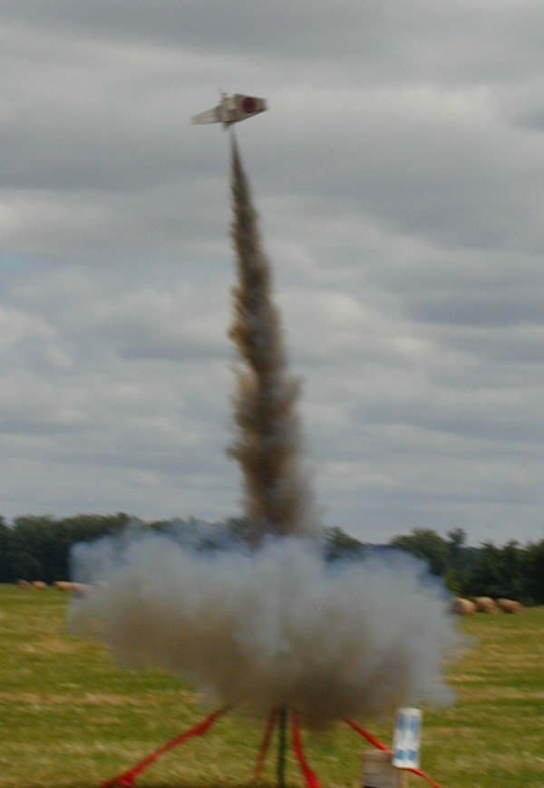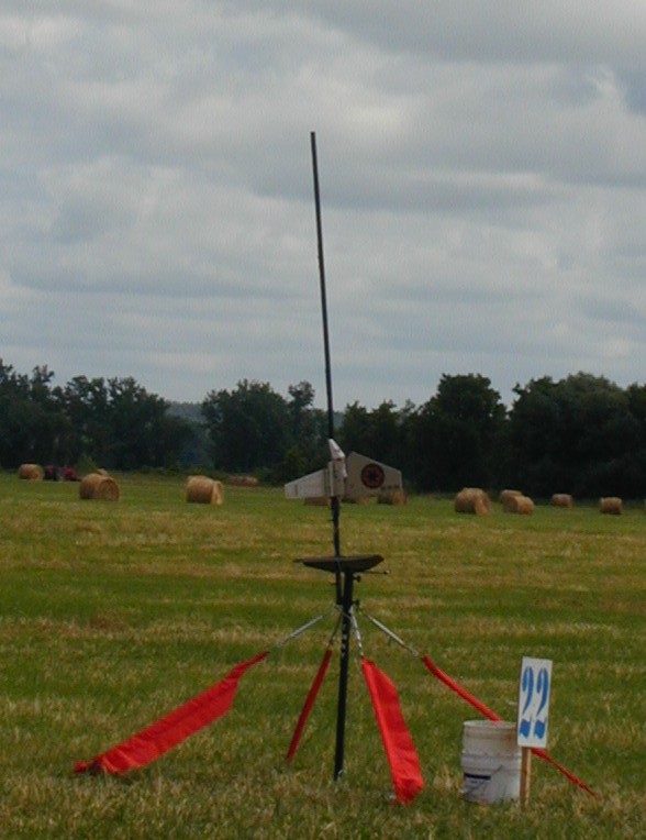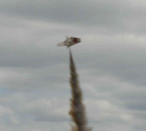 Pic 43: Launch She WAS stable! It was very nice to only about 300 feet. Upon ejection the nose cone did separate and land on its own parachute. The body parachute did not deploy. |