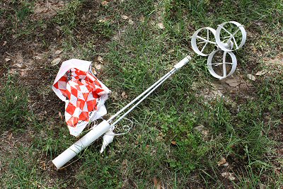 Rocket went up nicely, but that's where things went wrong. It was well on its way down when the ejection charge fired. Unfortunately the parachute didn't deploy and it broke in half and bent the vent tubes when it hit the ground.