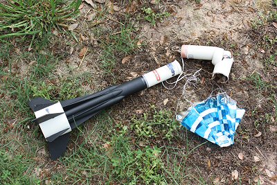 The launch was kinda weird this time, and the parachutes didn't deploy. The rocket lawn-darted (strange for a tail-heavy rocket). The central engine with the ejection charge didn't light. Oops. Will be repaired.