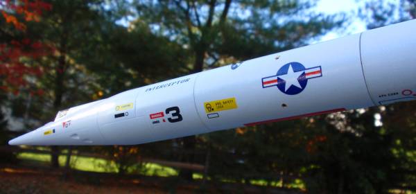 This view of the nose of the Interceptor shows the main weponry module just behind the cockpit. Behind that, in this test model is the electronics bay. In this particular stretched model, an Altimeter 2 is installed to gather data on altitude, G-forces, and speeds. This one-of-a-kind test model is 3-3/16" longer than stock, and weighs an additional 19 grams fully loaded, plus an additional 17 grams of noseweight for stability. Two of the four gold-lined static-ports can be seen just above and below the star emblem. Behind the electronics bay is the emergency parachute bay, used just in case the imaginary landing gear doesn't extend in flight.