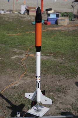 Arcing flight. Old motor. Delay went way long. When ejected the payload section knocked off two fins, then the body flew into the chute and cracked another on landing. I am done. Three bad flights. Will salvage the payload section and try something else.