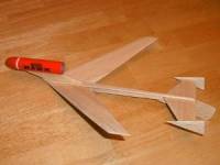 This is Semroc's Retro-Repro kit of the 1965 AMROCS Hawk. It is a swept-wing boost-glider that uses motor ejection to