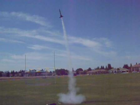 First flight of the Box 'o Parts model. Flew great, but chute caught on tail at ejection. Fell in a flat spin and popped top tailfins off on impact. Repairable.