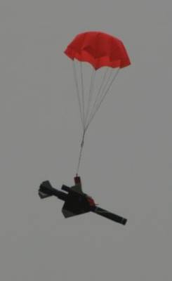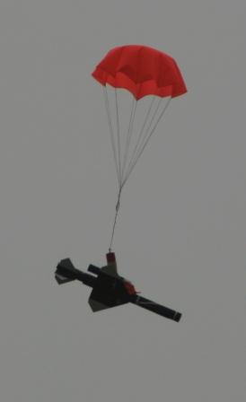 Great climb, no roll like last time. Ejected at the right point, but shock cord caught on ramjet. Made it fall flat and upside down. Worked pretty well, actually.