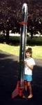Single 38 mm engine rocket almost 8" in diameter and 4.4' high with chute, plywood fins, cardboard tube and plastic nosecone.