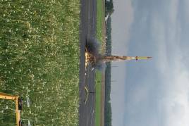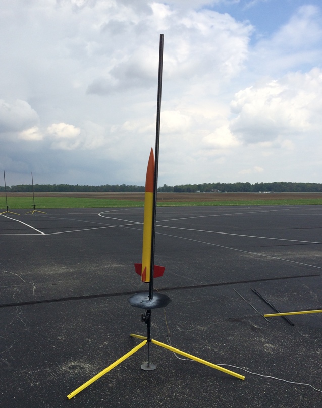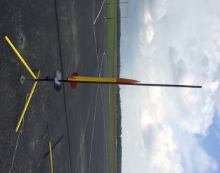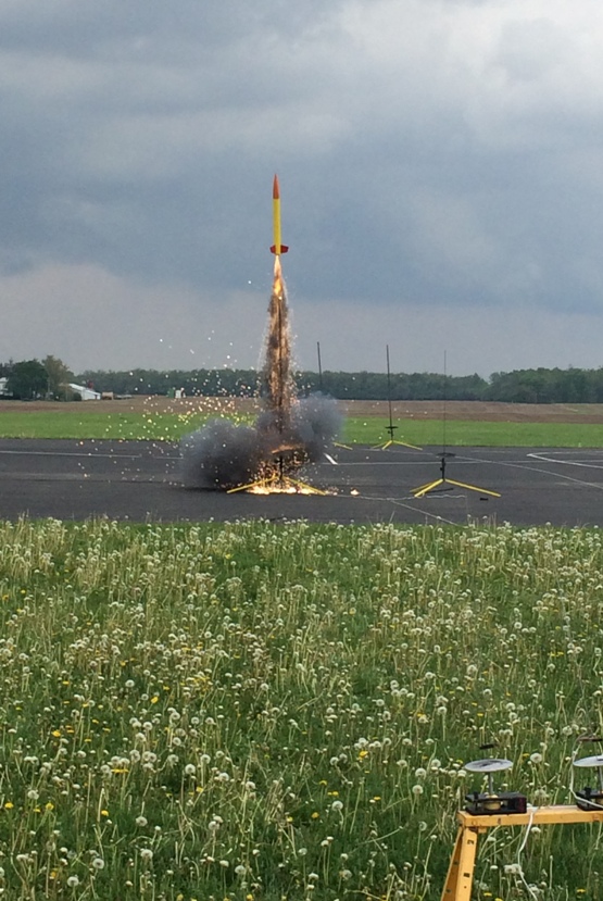 Lept off the pad in the requisite shower of sparks. Drifted quite a ways and found the other chunk of tar in the 1000 acres of grass where we launch. Dinged up the motor retainer some, but it still comes apart and goes back together.