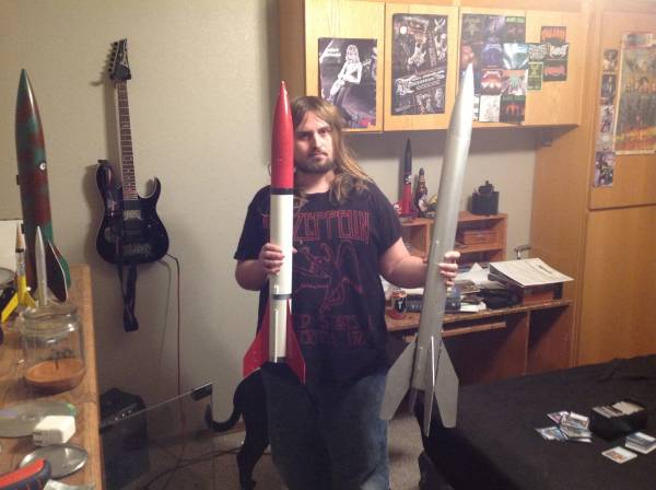 AKA: Johnny rocket, Mr. scratch Favorite Rockets: Estes thunder hawk, Estes red max, my silver surfer rocket, Biography: Well my name is Jonathan, I'm 22 years old, and I love rocketry. I have been going to launches for 18 years, and building rockets for about 11. My dad was into them and built them all the time, and I would watch him build when I got old enough to understand. Once I was old enough to read and understand the instructions. I built my first rocket kit, which was an Estes thunderhawk. It was one of my favorite kits because of how slow and cool it flew. Sadly, it was left in the car with windows down, and it got water damaged from rain. I miss that kit soo much and wish Estes would bring it back. I now own 19 rockets, many are scratch builds, most are kits. I have lost some and some have crashed, some were broken from negligence, and even had one stolen from a friend! I am not high power certified, but I do plan on going to level two at least some day. 3 is a little too expensive and I don't think I could handle the pressure and technical side of it. I have goofed around many times with rocket engines before and made many one time rockets for fun as well. Anyways to whomever is reading, may the skies be clear and blue, and may all of your rockets fly straight and true (-: