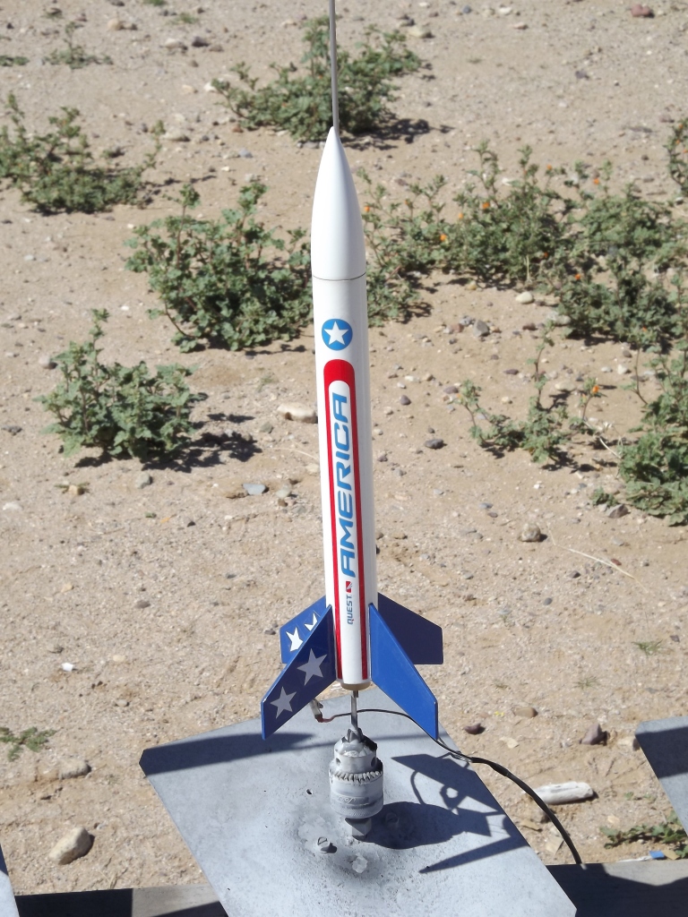 This is a four fin plastic nosecone rocket. It has die cut balsa fins, a kevlar and elastic shock cord. One of the newer kits Quest introduced in the 2010 catalog.