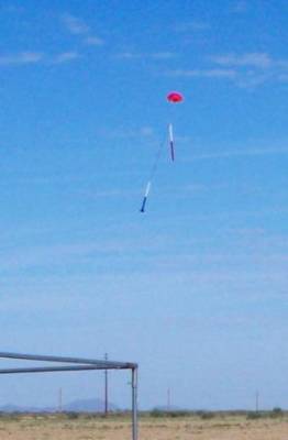 Good straight flight with soft parachute landing about 100 feet from launch pad. Rocket modified to separate in center.