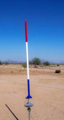 Good first flight for the 76er. Smooth, straight flight with parachute ejection and soft landing. Rocket modified to separate in center, added ejection charge baffle, added bulkhead (to separate rocket in center) and added 24 inch red nylon parachute.