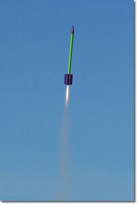 BTW, tube fin rockets have no need for conventional mini-fins tacked on to the tubes. More drag...what were they thinking? My SNXL has none and I like it like that.  I used Testors Metallic Lime and Metallic Purple to basically follow the paint scheme on the kit cardboard.  The parachute has been upgraded to a fluorescent green Top Flight 24" chute and I added a 6"x6" flame-resistant blanket to protect my chute investment.  In typical tube fin fashion, this rocket flies straight up and even tail slides a bit after apogee until the chute deploys.