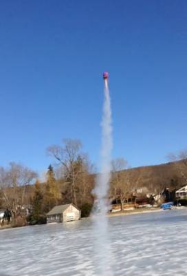 Second test launch of MUACIII. This time I'm testing on a D12-0 and also with a ring of hair to see how the hair does when the end isn't plugged (hair didn't do well). Rocket rose up quickly with a beautiful spiral and went very high...became a speck, but still trackable. Wind pushed it a bit and it landed about 40' from pad on ice with the distinctive "konk" of an empty plastic cup falling down on the floor on it's end...kid found that sound very amusing and laughed out loud. Hair was singed pretty well on one side, so unplugged cup and hair doesn't mix. =D
