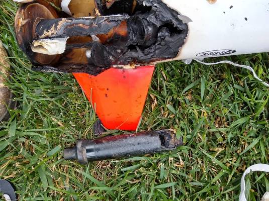 CATO! People had just told me how they liked/loved my Nike Smoke and go figure I use an old stock (stored well in my living room in a ammo container) Estes PSII DMS motor and it blew up on launch! Rocket jumped off the rail and about 10' up apparently a section of the forward part of the motor exploded out the side of teh rocket causing a fiery spiral and then landed in flames. I put out the fire quickly, but rocket is toast. Motor also showed a burn line down the side of the motor. RIP