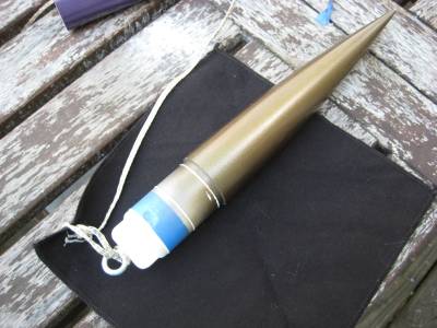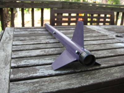 Last but not least, I cut a small hole in the nose cone shoulder and dropped in a 3/16" nut which I used to secure the eyebolt. I added a couple of drips of epoxy into the hole to secure the nut. Once assembly was complete, I painted the rocket using Krylon gray primer followed by two coats of Krylon purple. I left the tailcone unpainted, and I painted the nose cone using Krylon metallic bronze. I applied two coats of Krylon clear once the paint had dried for several days.