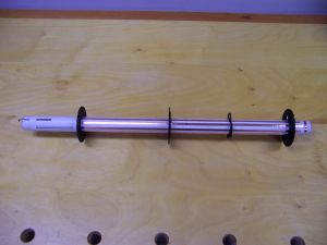 The fins were finally epoxied to the aft end of the rocket, aligned with the slots in the engine hook cover. Epoxy fillets were placed along both sides of each fin along the body tube and where the fin touched the aft centering ring. The screw eye was then glued into the pre-drilled hole of the nosecone. This finished the assembly that could be done before painting.