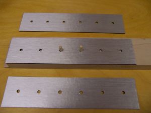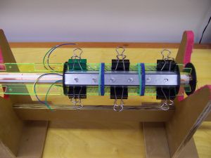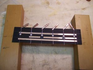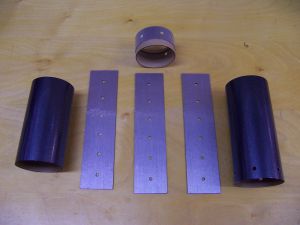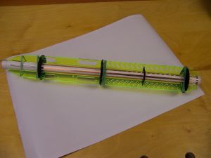 The three LED panels were assembled from the cardboard fiber panels, more copper foil, electrical tape, and six LEDS (green) by carefully following the detailed instructions. Before assembly began the flat panels were covered on one side with silver metallic vinyl. I made a jig to attach the vinyl to the LED covers. The holes in the vinyl were not spaced perfectly to match holes in the covers, but by referencing on the center two holes (see dowels in picture), the error got spread out so there was less than 1/16" misalignment on the outer holes. The LEDs were soldered onto the copper foils to create two circuits per panel, and three wires were soldered to each panel to provide a means of later connecting the LED circuits to the copper traces on the airframe tube. Once assembled, the panels were epoxied onto the airframe, using binder clips and rubber bands to hold them in place until the epoxy set. The color-coded wires were soldered to the matching color copper traces on the airframe assembly. This creates an 8 in long middle section with exposed acrylic ribs and three 6-LED panels. Spectacular look.