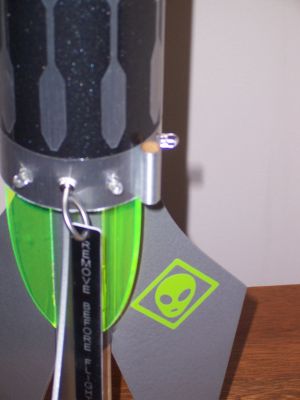 The Alien is a single-staged mid-power rocket with a 20" nylon parachute, metallic wraps and decals, and 39 LEDs, animated by a micro electronics module that allow night launches and recoveries. It is the third and largest rocket so far in the "Night Flight Equipped" line of rockets from Leading Edge Rocketry.