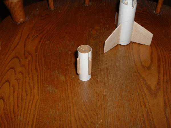 Lil' Augie - Booster moduleHolds booster motor in augmenter tube This is a modification that I made. The original plans called for gluing the balsa vanes directly onto the motor case. My plan was to wrap a Mylar streamer around the vanes before inserting the module. The purpose of the streamer was primarily to make the module easier to track after it was ejected. |